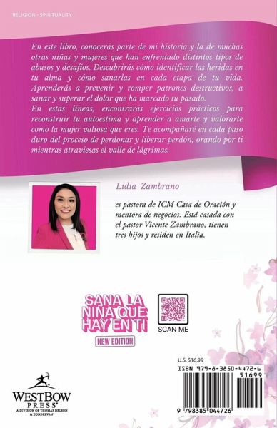 "Sana la niña que hay en ti" es una obra transformadora que combina el testimonio personal de Lidia Zambrano con una guía práctica para enfrentar el dolor del pasado y encontrar sanidad emocional y espiritual. Basado en experiencias reales, este libro aborda con valentía el impacto del abuso sexual y otros traumas en la vida de una mujer, ofreciendo herramientas concretas para identificar y superar heridas profundas que afectan la autoestima, las relaciones y el propósito de vida. El libro se divide en capítulos que exploran el perfil de los agresores y las víctimas, cómo el abuso afecta las relaciones interpersonales y las maldiciones generacionales que pueden perpetuar patrones dañinos. Además, invita a las lectoras a descubrir el poder del perdón como la clave para la verdadera libertad. A través de ejercicios prácticos, reflexiones bíblicas y ejemplos inspiradores, Lidia guía a las mujeres a reconstruir su autoestima, sanar su alma herida y vivir una vida plena y con propósito. Este libro no solo es una herramienta de sanidad personal, sino también un recurso para prevenir futuros abusos, fomentar el diálogo abierto en las familias y desarrollar una conexión profunda con Dios. "Sana la niña que hay en ti" es un llamado a dejar atrás el dolor y caminar hacia la libertad emocional y espiritual, recordando a cada mujer que su valor no está definido por su pasado, sino por el propósito divino para su vida. Es un libro para quienes buscan sanidad, restauración y una nueva esperanza, ofreciendo la certeza de que la verdadera ayuda proviene de Dios y que la sanidad del alma está al alcance de todas las mujeres que estén dispuestas a dar el primer paso hacia su liberación.