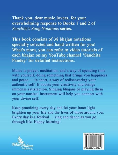 Thank you, dear music lovers, for your overwhelming response to Books 1 and 2 of Sanchita's Song Notations series. This book consists of 38 bhajan notations specially selected and hand-written for you! What's more, you can refer to video tutorials of each bhajan on my YouTube channel `Sanchita Pandey' for detailed instructions. Music is prayer, meditation, and a way of spending time with yourself, doing something that brings you happiness and peace - in short, a way of rediscovering your authentic self. It boosts your creativity and brings immense satisfaction. Singing bhajans or playing them on your musical instrument will help you connect with your divine self. Keep practicing every day and let your inner light brighten up your life and the lives of those around you. Every day is a festival ... sing and dance as you go through life. Happy learning!
