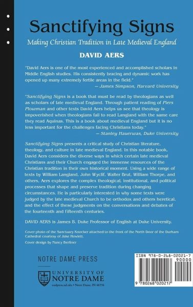 Concentrating on the sacrament of the altar, poverty, and conflicting versions of sanctity, Sanctifying Signs presents a critical study of Christian literature, theology, and culture in late medieval England. In this notable book, David Aers considers the diverse ways in which certain late medieval Christians and their Church engaged the immense resources of the Christian tradition in their own historical moment. Using a wide range of texts, Aers explores the complex theological, institutional, and political processes that shape and preserve tradition during changing circumstances. He is particularly interested in why some texts were judged by the late medieval Church to be orthodox and others heretical, and the effect of these judgments on the conversations and debates of the fourteenth and fifteenth centuries. Sanctifying Signs begins with accounts of the sacrament of the altar that were deemed orthodox in the late medieval Church. Aers then shifts his focus to the relationship between sanctification and the sign of poverty. Finally, he reflects on the relationship between some versions of domesticity and sanctification. Texts of William Langland, John Wyclif, Walter Brut, William Thorpe, and others, Aers explores the complex theological, institutional, and political processes that shape and preserve tradition during changing circumstances. He is particularly interested in why some texts were judged by the late medieval Church to be orthodox and others heretical, and the effect of these judgments on the conversations and debates of the fourteenth and fifteenth centuries.