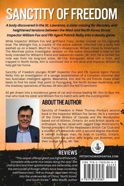 While Inspector William Fox and girlfriend Tracy Jordan cruised on his cigarette boat The Midnight Fox, a crackle of the police scanner informed him a body had washed up on a beach. Much to Tracy's disapproval, William chose to investigate. The Montreal police investigator already on the scene discovered a note on the body intended for William's friend and taekwondo master, Mr. Kim. He is certain the note was from his long-lost sister, Mi-Cha. Kidnapped, while still a child, and trapped in North Korea, Kim is convinced she is still alive and implores William to help get her home. Sanctity of Freedom plunges RCMP Inspector Fox and FBI Special Agent Patrick Reilly into an investigation of a savage assassination of a Canadian diplomat and two Australian intelligent agents. Meanwhile, Kim and his old friends chase down leads to find his sister that point to Pyongyang, the North Korean leadership, and the shadowy operatives of Bureau 39 who skirt the NATO sanctions. All of them get drawn into a murderous game of cat and mouse leading Mr. Kim to face the man who tookand William Fox to match wits with the cunning killer.