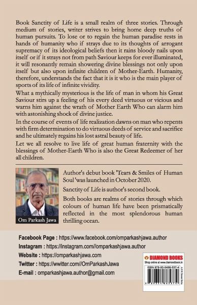 Book Sanctity of Life is a small realm of three stories. Through medium of stories, writer strives to bring home deep truths of human pursuits. To lose or to regain the human paradise rests in hands of humanity who if strays due to its thoughts of arrogant supremacy of its ideological beliefs then it rains bloody nails upon itself or if it strays not from path Saviour keeps for ever illuminated, it will resonantly remain showering divine blessings not only upon itself but also upon infinite children of Mother-Earth. Humanity, therefore, understands the fact that it is it who is the main player of sports of its life of infinite vividity. What a mythically mysterious is the life of man in whom his Great Saviour stirs up a feeling of his every deed virtuous or vicious and warns him against the wrath of Mother Earth Who can alarm him with astonishing shock of divine justice. In the course of events of life realization dawns on man who repents with firm determination to do virtuous deeds of service and sacrifice and he ultimately regains his lost astral beauty of life. Let we all resolve to live life of great human fraternity with the blessings of Mother-Earth Who is also the Great Redeemer of her all children.