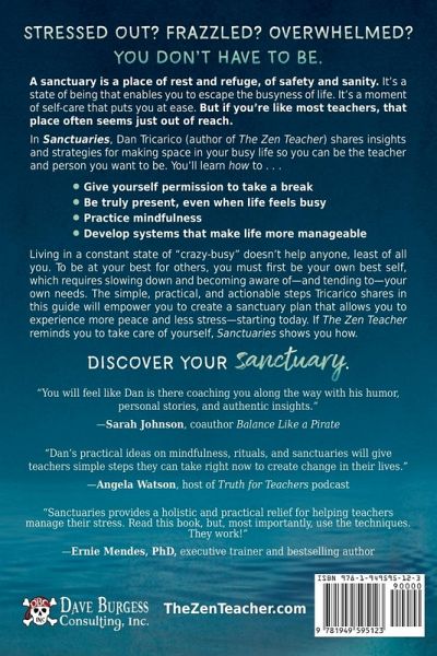 Stressed out? Frazzled? Overwhelmed? You don't have to be. A sanctuary is a place of rest and refuge, of safety and sanity. It's a state of being that enables you to escape the busyness of life. It's a moment of self-care that puts you at ease. But if you're like most teachers, that place often seems just out of reach. In Sanctuaries, Dan Tricarico (author of The Zen Teacher) shares insights and strategies for making space in your busy life so you can be the teacher and person you want to be. You'll learn how to . . . Give yourself permission to take a break Be truly present, even when life feels busy Practice mindfulness Develop systems that make life more manageable Living in a constant state of "crazy-busy" doesn't help anyone, least of all you. To be at your best for others, you must first be your own best self, which requires slowing down and becoming aware of-and tending to-your own needs. The simple, practical, and actionable steps Tricarico shares in this guide will empower you to create a sanctuary plan that allows you to experience more peace and less stress-starting today. If The Zen Teacher reminds you to take care of yourself, Sanctuaries shows you how. Discover your sanctuary. "You will feel like Dan is there coaching you along the way with his humor, personal stories, and authentic insights." -Sarah Johnson, coauthor Balance Like a Pirate "Dan's practical ideas on mindfulness, rituals, and sanctuaries will give teachers simple steps they can take right now to create change in their lives." -Angela Watson, host of Truth for Teachers podcast "Sanctuaries provides a holistic and practical relief for helping teachers manage their stress. Read this book, but, most importantly, use the techniques. They work!" -Ernie Mendes, PhD, executive trainer and bestselling author