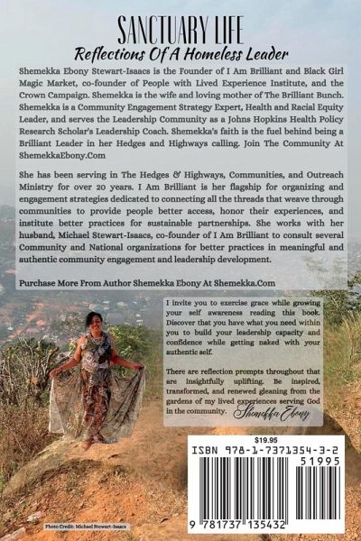 Shemekka Ebony, Author of While I'm Getting Naked Journal Journey, is a Leadership Coach and Philanthropist who lives, works, prays, and plays with her husband Michael Stewart-Isaacs, their sons, Lomari, Coren, Chi-Alexander, and Ade'Maximus, and daughter Alihera in North Carolina. She holds a Bachelor of Arts Degree in Psychology and a Master of Science Degree in Counseling Studies and has co-authored serval research writings/publications addressing health equity, engagement tools, and engaging people with lived experience expertise. Much of this work was inspired by Shemekka Ebony's continuous lived experience journey in becoming the Sanctuary while in the hedges & highways. She has accepted her call as a Leadership Coach and shares the journey with her "Brilliant Bunch."