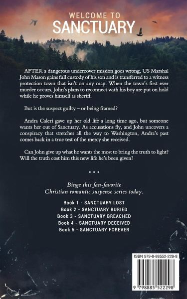 Welcome to Sanctuary. After a dangerous undercover mission goes wrong, US Marshal John Mason gains full custody of his son and is transferred to a witness protection town that isn't on any map. When the town's first ever murder occurs, John's plans to reconnect with his boy are put on hold while he proves himself as sheriff. But is the suspect guilty - or being framed? Andra Caleri gave up her old life a long time ago, but someone wants her out of Sanctuary. As accusations fly, and John uncovers a conspiracy that stretches all the way to Washington, Andra's past comes back in a true test of the mercy she received. Can John give up what he wants the most to bring the truth to light? Will the truth cost him this new life he's been given? Binge this fan-favorite Christian romantic suspense series today. Book 1 - Sanctuary Lost Book 2 - Sanctuary Buried Book 3 - Sanctuary Breached Book 4 - Sanctuary Deceived Book 5 - Sanctuary Forever