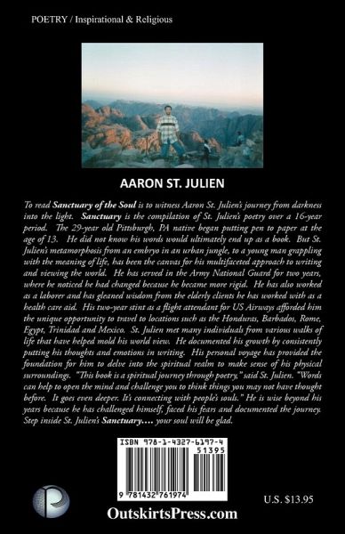 To read Sanctuary of the Soul is to witness Aaron St. Julien's journey from darkness into the light. St. Julien's metamorphosis from an embryo in an urban jungle, to a young man grappling with the meaning of life, has been the canvas for his multifaceted approach to writing and viewing the world. "This book is a spiritual journey through poetry," said St. Julien. "Words can help to open the mind and challenge you to think things you may not have thought before. It goes even deeper. It's connecting with people's souls" He is wise beyond his years because he has challenged himself, faced his fears and documented the journey. Step inside St. Julien's Sanctuary... your soul will be glad.