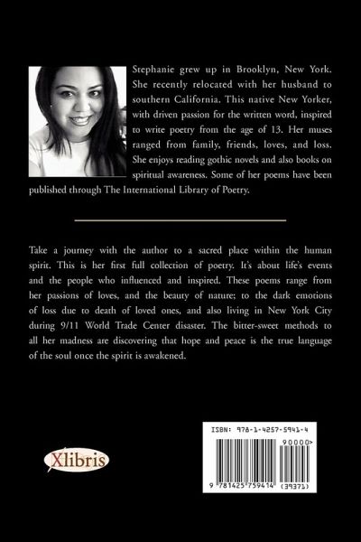 Take a journey with the author to a sacred place within the human spirit. This is her first full collection of poetry. It's about life's events and the people who influenced and inspired. These poems range from her passions of loves, and the beauty of nature; to the dark emotions of loss due to death of loved ones, and also living in New York City during 9/11 World Trade Center disaster. The bitter-sweet methods to all her madness are discovering that hope and peace is the true language of the soul once the spirit is awakened.