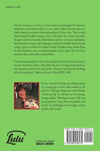 David continues to have a trust issue eventhough his abusive stepfather and mother died in a car crash. Mark does his best as a foster parent to remain calm and explain his few rules. Then a deaf child named Freddie comes to live with them for a short stay after his great-uncle is injured. Mark feels a need to carry pen and paper, but David has begun sign language at church. Freddie loves to joke using a play on words to confuse David. Freddie learns about Jesus for the first time, not even knowing the correct sign. The two boys become close, much like real brothers. "Heartwarming tale of a boy whose physical and spiritual needs are met by his foster father. Describes the boy's background of abuse and abandonment by his step-father. Honestly portrays the feelings of his foster father." Rebecca French Day, BSW, LSW