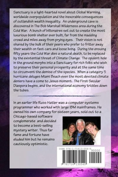 Sanctuary is a light-hearted novel about Global Warming, worldwide overpopulation and the inexorable consequences of outlandish wealth inequality. An underground cave is discovered in The Bob Marshall Wilderness area during the Cold War. A bunch of billionaires set out to create the most luxurious bomb shelter ever built, far from the madding crowd and miles away from prying eyes. Their vision is not shared by the bulk of their peers who prefer to fritter away their wealth on fast cars and loose living. During the ensuing fifty years the Cold War dies a natural death, to be replaced by the existential threat of Climate Change. The opulent hole in the ground morphs into a Sanctuary for rich folks who wish to preserve their personal prosperity and at the same time to circumvent the demise of the species. When a category 5 hurricane deluges Miami Beach even the most devoted climate deniers have a come to Jesus moment.