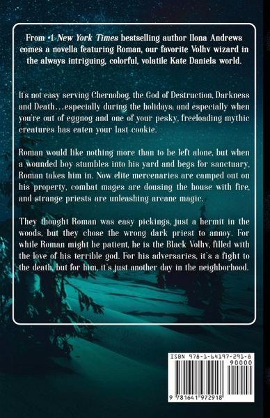 From #1 New York Times bestselling author Ilona Andrews comes a novella featuring Roman, our favorite Volhv wizard in the always intriguing, colorful, volatile Kate Daniels world. It's not easy serving Chernobog, the God of Destruction, Darkness and Death...especially during the holidays; and especially when you're out of eggnog and one of your pesky, freeloading mythic creatures has eaten your last cookie. Roman would like nothing more than to be left alone, but when a wounded boy stumbles into his yard and begs for sanctuary, Roman takes him in. Now elite mercenaries are camped out on his property, combat mages are dousing the house with fire, and strange priests are unleashing arcane magic. They thought Roman was easy pickings, just a hermit in the woods, but they chose the wrong dark priest to annoy. For while Roman might be patient, he is the Black Volhv, filled with the love of his terrible god. For his adversaries, it's a fight to the death, but for him, it's just another day in the neighborhood.