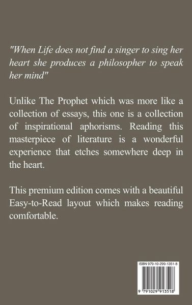 "When Life does not find a singer to sing her heart she produces a philosopher to speak her mind" Unlike The Prophet which was more like a collection of essays, this one is a collection of inspirational aphorisms. Reading this masterpiece of literature is a wonderful experience that etches somewhere deep in the heart. This premium edition comes with a beautiful Easy-to-Read layout which makes reading comfortable.