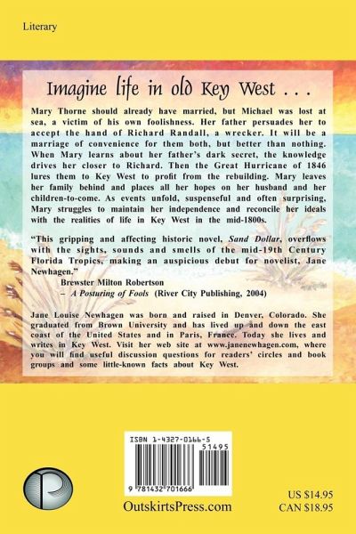 Imagine life in old Key West . . . Mary Thorne should already have married, but Michael was lost at sea, a victim of his own foolishness. Her father persuades her to accept the hand of Richard Randall, a wrecker. It will be a marriage of convenience for them both, but better than nothing. When Mary learns about her father's dark secret, the knowledge drives her closer to Richard. Then the Great Hurricane of 1846 lures them to Key West to profit from the rebuilding. Mary leaves her family behind and places all her hopes on her husband and her children-to-come. As events unfold, suspenseful and often surprising, Mary struggles to maintain her independence and reconcile her ideals with the realities of life in Key West in the mid-1800's. "This gripping and affecting historic novel, Sand Dollar, overflows with the sights, sounds and smells of the mid-19th Century Florida Tropics, making an auspicious debut for novelist, Jane Newhagen." Brewster Milton Robertson - A Posturing of Fools (River City Publishing, 2004)