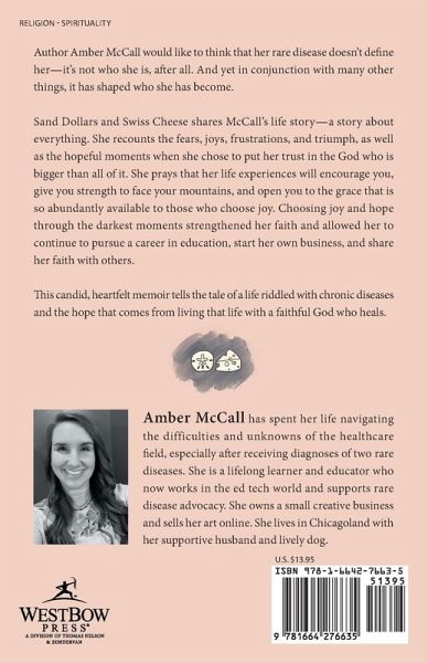 Author Amber McCall would like to think that her rare disease doesn't define her-it's not who she is, after all. And yet in conjunction with many other things, it has shaped who she has become. Sand Dollars and Swiss Cheese shares McCall's life story-a story about everything. She recounts the fears, joys, frustrations, and triumph, as well as the hopeful moments when she chose to put her trust in the God who is bigger than all of it. She prays that her life experiences will encourage you, give you strength to face your mountains, and open you to the grace that is so abundantly available to those who choose joy. Choosing joy and hope through the darkest moments strengthened her faith and allowed her to continue to pursue a career in education, start her own business, and share her faith with others. This candid, heartfelt memoir tells the tale of a life riddled with chronic diseases and the hope that comes from living that life with a faithful God who heals.