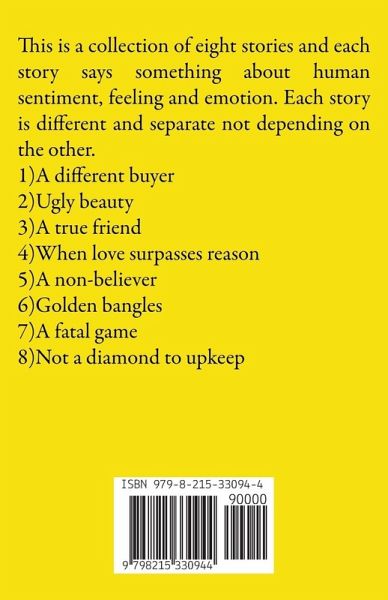 This is a collection of eight stories and each story says something about human sentiment, feeling and emotion. Each story is different and separate not depending on the other. 1)A different buyer 2)Ugly beauty 3)A true friend 4)When love surpasses reason 5)A non-believer 6)Golden bangles 7)A fatal game 8)Not a diamond to upkeep