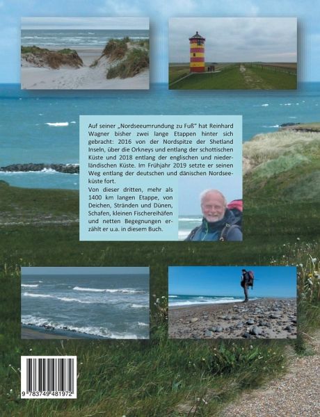 Auf seiner "Nordseeumrundung zu Fuß" hat Reinhard Wagner bisher zwei lange Etappen hinter sich gebracht: 2016 von der Nordspitze der Shetland Inseln, über die Orkneys und entlang der schottischen Küste und 2018 entlang der englischen und niederländischen Küste. Im Frühjahr 2019 setzte er seinen Weg entlang der deutschen und dänischen Nordseeküste fort.Von dieser dritten, mehr als 1400 km langen Etappe, von Deichen, Stränden und Dünen, Schafen, kleinen Fischereihäfen und netten Begegnungen erzählt er u.a. in diesem Buch.
