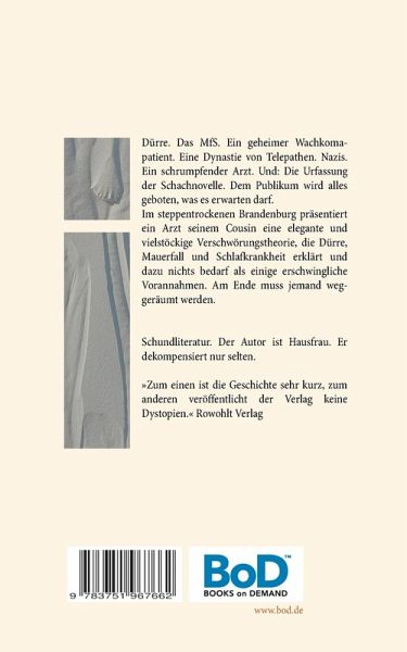 Dürre in Brandenburg. Das Ministerium für Staatssicherheit. Ein geheimer Wachkomapatient. Eine Dynastie von Telepathen. Ein schrumpfender Arzt. Und: Die Urfassung der Schachnovelle. Dem Publikum wird alles geboten, was es erwarten darf.Im steppentrockenen Brandenburg präsentiert ein Arzt seinem Cousin eine elegante und vielstöckige Verschwörungstheorie, die Dürre, Mauerfall und Schlafkrankheit zugleich erklärt und nichts bedarf als ein paar Vorannahmen. Am Ende muss jemand weggeräumt werden, den es nicht gibt.