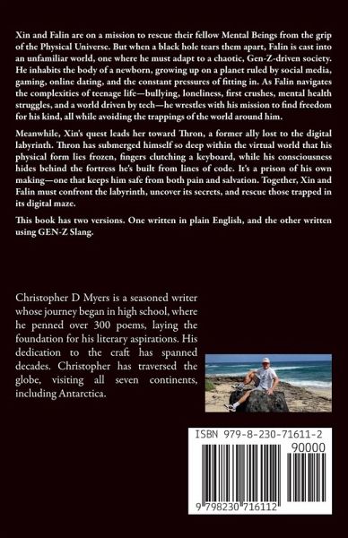 Xin and Falin are on a mission to rescue their fellow Mental Beings from the grip of the Physical Universe. But when a black hole tears them apart, Falin is cast into an unfamiliar world, one where he must adapt to a chaotic, Gen-Z-driven society. He inhabits the body of a newborn, growing up on a planet ruled by social media, gaming, online dating, and the constant pressures of fitting in. As Falin navigates the complexities of teenage life-bullying, loneliness, first crushes, mental health struggles, and a world driven by tech-he wrestles with his mission to find freedom for his kind, all while avoiding the trappings of the world around him. Meanwhile, Xin's quest leads her toward Thron, a former ally lost to the digital labyrinth. Thron has submerged himself so deep within the virtual world that his physical form lies frozen, fingers clutching a keyboard, while his consciousness hides behind the fortress he's built from lines of code. It's a prison of his own making-one that keeps him safe from both pain and salvation. Together, Xin and Falin must confront the labyrinth, uncover its secrets, and rescue those trapped in its digital maze. This book has two versions. One written in plain English, and the other written using GEN-Z Slang.