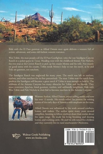 Ride with the El Paso gunman as Alfred Dennis once again delivers a western full of action and adventure with some old-fashion western romance. Wes Tobin, the man people call the El Paso Gunfighter, wins the vast Sandigras Canyon Ranch in a poker game in Texas. Heading west with his childhood friend, Pole Nichols, the two stop at the Crown Ranch to pick up his cousin Monte and his wife. Not exactly on good terms with his cousin, Tobin needs Monte's help to run the ranch, as he and Pole are gunmen, not ranchers. The Sandigras Ranch was neglected for many years. The ranch was left to outlaws, rustlers, and other ranchers for its fine pastureland. The man Tobin won the ranch from predicts the Sandigras will become a great ranch if Tobin is man enough to hold it. The wildness of the Arizona Canyons has many obstacles for Tobin and his friends. They must overcome Apaches, hired gunmen, rustlers, and unfriendly neighbors. Ride with Wes Tobin and Pole Nichols in their bid to become ranchers in the Arizona Canyons.