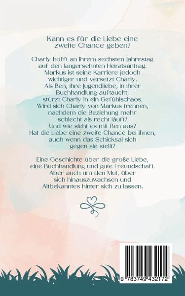 Kann es für die Liebe eine zweite Chance geben?Charly hofft an ihrem sechsten Jahrestag auf den langersehnten Heiratsantrag.Markus ist seine Karriere jedoch wichtiger und versetzt Charly.Als Ben, ihre Jugendliebe, in ihrer Buchhandlung auftaucht, stürzt Charly in ein Gefühlschaos.Wird sich Charly von Markus trennen, nachdem die Beziehung mehr schlecht als recht läuft?Und wie sieht es mit Ben aus?Hat die Liebe eine zweite Chance bei ihnen, auch wenn das Schicksal sich gegen sie stellt?Eine Geschichte über die große Liebe, eine Buchhandlung und gute Freundschaft. Aber auch um den Mut, über sich hinauszuwachsen und Altbekanntes hinter sich zu lassen.
