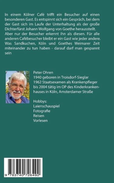 In einem Kölner Café trifft ein Besucher auf einen besonderen Gast. Es entspinnt sich ein Gespräch, bei dem der Gast sich im Laufe der Unterhaltung als der große Dichter Johann Wolfgang von Goethe herausstellt. Aber nur der Besucher erkennt ihn als diesen. Für alle anderen Café Besucher bleibt er ein Gast wie jeder andere.Was Sandkuchen, Köln und Goethes Weimarer Zeit miteinander zu tun haben, darauf darf man gespannt sein.