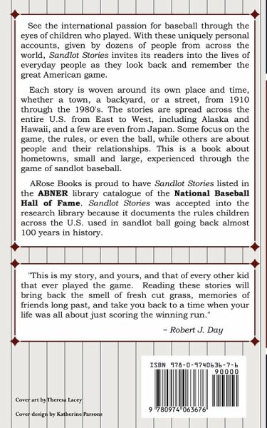 See the international passion for baseball through the eyes of children who played. With these uniquely personal accounts, given by dozens of people from across the world, Sandlot Stories invites its readers into the lives of everyday people as they look back and remember the great American game. Each story is woven around its own place and time, whether a town, a backyard, or a street, from 1910 through the 1980's. The stories are spread across the entire U.S. from East to West, including Alaska and Hawaii, and a few are even from Japan. Some focus on the game, the rules, or even the ball, while others are about people and their relationships. This is a book about hometowns, small and large, experienced through the game of sandlot baseball. The book is broken into three sections: Opening Pitch - stories about childhood sandlot games and the rules used; Seventh Inning Stretch - stories about childhood baseball and how baseball is part of adult life for the writer; and finally the most surprising stories in the third section, The Game That Never Ends - stories in which the writer had a profound life or spiritual experience around playing baseball.