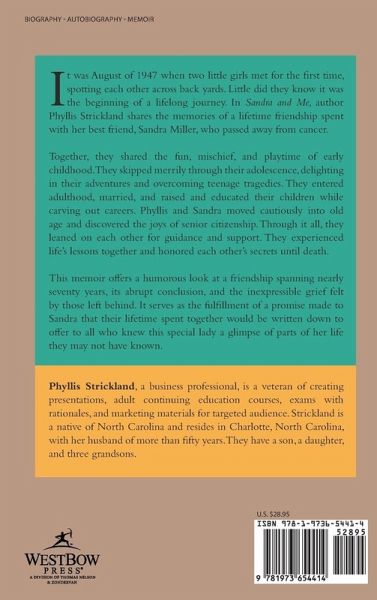 It was August of 1947 when two little girls met for the first time, spotting each other across back yards. Little did they know it was the beginning of a lifelong journey. In Sandra and Me, author Phyllis Strickland shares the memories of a lifetime friendship spent with her best friend, Sandra Miller, who passed away from cancer. Together, they shared the fun, mischief, and playtime of early childhood. They skipped merrily through their adolescence, delighting in their adventures and overcoming teenage tragedies. They entered adulthood, married, and raised and educated their children while carving out careers. Phyllis and Sandra moved cautiously into old age and discovered the joys of senior citizenship. Through it all, they leaned on each other for guidance and support. They experienced life's lessons together and honored each other's secrets until death. This memoir offers a humorous look at a friendship spanning nearly seventy years, its abrupt conclusion, and the inexpressible grief felt by those left behind. It serves as the fulfillment of a promise made to Sandra that their lifetime spent together would be written down to offer to all who knew this special lady a glimpse of parts of her life they may not have known.