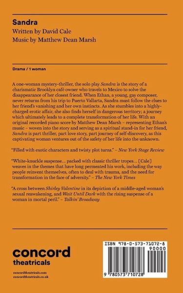 In this one-woman thriller, Sandra seeks to get to the bottom of the mysterious disappearance of her closest friend, a young pianist and composer who went on a trip to Mexico and never returned. Her search for clues leads her into both a highly charged love affair and increasingly dangerous territory. Sandra asks, "How far would you go for love?"