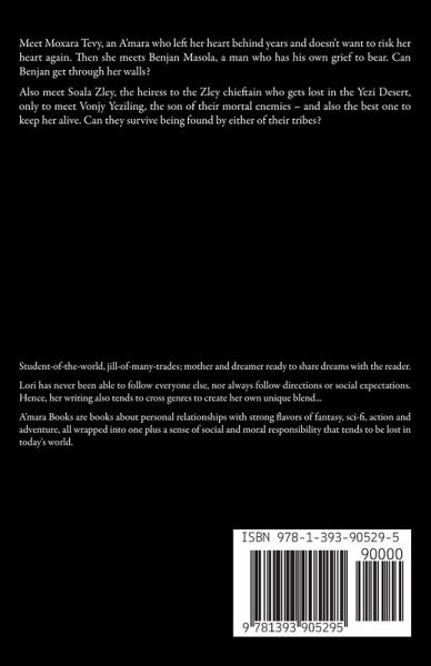 Meet Moxara Tevy, an A'mara who left her heart behind years and doesn't want to risk her heart again. Then she meets Benjan Masola, a man who has his own grief to bear. Can Benjan get through her walls? Also meet Soala Zley, the heiress to the Zley chieftain who gets lost in the Yezi Desert, only to meet Vonjy Yeziling, the son of their mortal enemies - and also the best one to keep her alive. Can they survive being found by either of their tribes?