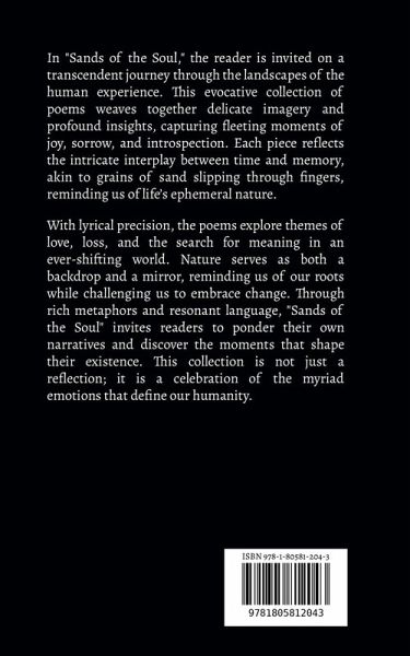 In "Sands of the Soul," the reader is invited on a transcendent journey through the landscapes of the human experience. This evocative collection of poems weaves together delicate imagery and profound insights, capturing fleeting moments of joy, sorrow, and introspection. Each piece reflects the intricate interplay between time and memory, akin to grains of sand slipping through fingers, reminding us of life's ephemeral nature. With lyrical precision, the poems explore themes of love, loss, and the search for meaning in an ever-shifting world. Nature serves as both a backdrop and a mirror, reminding us of our roots while challenging us to embrace change. Through rich metaphors and resonant language, "Sands of the Soul" invites readers to ponder their own narratives and discover the moments that shape their existence. This collection is not just a reflection; it is a celebration of the myriad emotions that define our humanity.