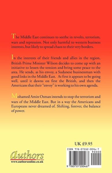 The Middle East continues to seethe in revolts, terrorism, wars and repression. Not only harmful to western business interests, but likely to spread chaos to their very borders. In the interests of their friends and allies in the region, British Prime Minister Wilson decides to come up with an initiative to lessen the tension and bring some peace to the area. He sends, as his envoy, a Sudanese businessman with good links in the Middle East. At first it appears to be going well, until it dawns on first the British, and then the Americans that their "envoy" is working to his own agenda. Mohamed Amin Osman intends to stop the terrorism and wars of the Middle East. But in a way the Americans and Europeans never dreamed of. Shifting, forever, the balance of power.