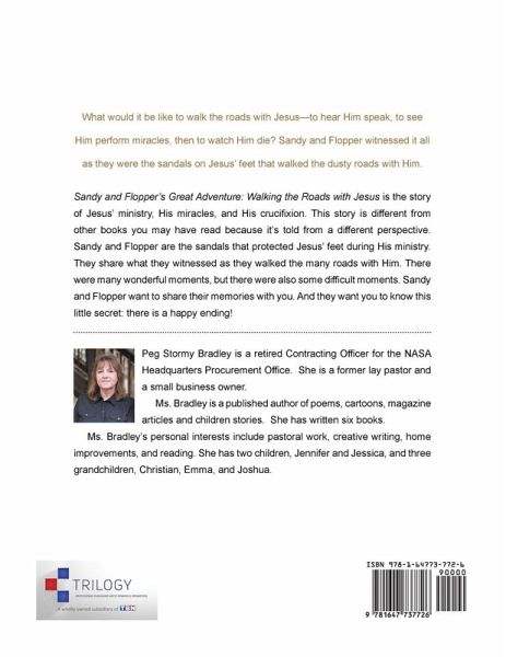 What would it be like to walk the roads with Jesus-to hear Him speak, to see Him perform miracles, then to watch Him die? Sandy and Flopper witnessed it all as they were the sandals on Jesus' feet that walked the dusty roads with Him. Sandy and Flopper's Great Adventure: Walking the Roads with Jesus is the story of Jesus' ministry, His miracles, and His crucifixion. This story is different from other books you may have read because it's told from a different perspective. Sandy and Flopper are the sandals that protected Jesus' feet during His ministry. They share what they witnessed as they walked the many roads with Him. There were many wonderful moments, but there were also some difficult moments. Sandy and Flopper want to share their memories with you. And they want you to know this little secret: there is a happy ending!