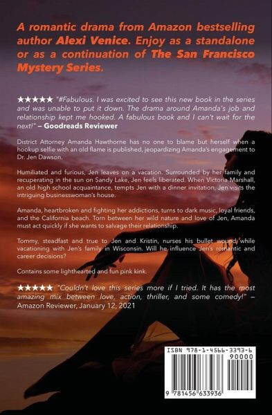 A romantic drama from Amazon bestselling author Alexi Venice. Enjoy as a standalone or as a continuation of The San Francisco Mystery Series. District Attorney Amanda Hawthorne's recent reunion with Dr. Jen Dawson is jeopardized by new revelations about Amanda's past indiscretion. Furious at Amanda, Jen leaves on a vacation with her daughter, Kristin, and Kristin's father, Detective Tommy Vietti. Surrounded by her family and basking in the sun on Sandy Lake, Jen feels liberated. When an old high school acquaintance tempts Jen's carnal curiosity, she makes a surprise trip to a nearby town. Amanda, heartbroken and fighting her addictions, turns to dark music, loyal friends, and the California beach. Will she be able to resist her go-to mix of vices and lovers? Torn between her true nature and love of Jen, Amanda must act quickly if she wants to salvage their relationship. Meanwhile, she faces enemies at work who believe they've gained the upper hand to defeat her once and for all. Tommy, steadfast and true to Jen and Kristin, nurses his bullet wound while vacationing with Jen's family in Wisconsin. Will he influence Jen's romantic and career decisions? Warning: Contains some pink kink.