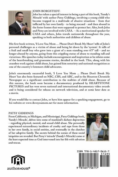 From California, to Michigan, and Mississippi, Patsy Giddings book, 'Sandy's Miracle', delves into some of mankind's darkest depravities - regarding physical, mental, and sexual child abuse. She personally experienced extraordinary incidents of cruelty and rape from those in her own family, in social entities, and eventually in the clutches of her adoptive family. The secrets behind the scenes of these social iniquities are revealed. But Patsy's 'miracle' (Sandy's Miracle) came at the least expected time as God intervened into her life with salvation and rescue.