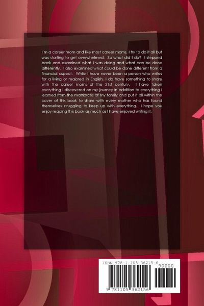I'm a career mom and like most career moms, I try to do it all but was starting to get overwhelmed. I stepped back and examined what I was doing and what can be done differently. I have taken everything I discovered on my journey in addition to everything I learned from the matriarchs of my family and put it all within the cover of this book to share with every mother who has found themselves struggling to keep up with everything. I have included recipes, money saving tips, relaxations tips, and most importantly - how to keep your sanity.