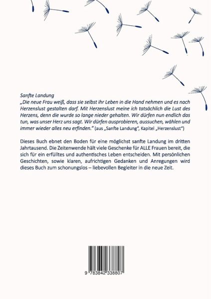 "Die neue Frau weiß, dass sie selbst ihr Leben in die Hand nehmen und es nach Herzenslust gestalten darf. Mit Herzenslust meine ich tatsächlich die Lust des Herzens, denn die wurde so lange nieder gehalten. Wir dürfen nun endlich das tun, was unser Herz uns sagt. Wir dürfen ausprobieren, aussuchen, wählen und immer wieder alles neu erfinden." (aus "Sanfte Landung", Kapitel "Herzenslust")Dieses Buch ebnet den Boden für eine möglichst sanfte Landung im dritten Jahrtausend. Die Zeitenwende hält viele Geschenke für ALLE Frauen bereit, die sich für ein erfülltes und authentisches Leben entscheiden. Themen wie Frau sein, Mutter sein, Intuition, Selbstbestimmung, Liebe, Beziehungen und persönliche Entfaltung stehen im Mittelpunkt dieses Buches. Mit persönlichen Geschichten, sowie klaren, aufrichtigen Gedanken und Anregungen wird dieses Buch zum schonungslos - liebevollen Begleiter in die neue Zeit. Es geht um die Entwicklung einer neuen Achtsamkeit und um Strategien, zu sich selbst und somit zu allen anderen gut zu sein.