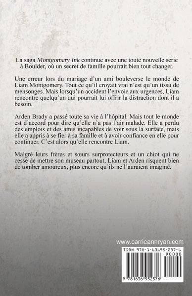 La saga Montgomery Ink continue avec une toute nouvelle série à Boulder, où un secret de famille pourrait bien tout changer. Une erreur lors du mariage d'un ami bouleverse le monde de Liam Montgomery. Tout ce qu'il croyait vrai n'est qu'un tissu de mensonges. Mais lorsqu'un accident l'envoie aux urgences, Liam rencontre quelqu'un qui pourrait lui offrir la distraction dont il a besoin. Arden Brady a passé toute sa vie à l'hôpital. Mais tout le monde est d'accord pour dire qu'elle n'a pas l'air malade. Elle a perdu des emplois et des amis incapables de voir sous la surface, mais elle a appris à se fier à sa famille et à avoir confiance en elle pour continuer. C'est alors qu'elle rencontre Liam. Malgré leurs frères et soeurs surprotecteurs et un chiot qui ne cesse de mettre son museau partout, Liam et Arden risquent bien de tomber amoureux, plus encore qu'ils ne l'auraient imaginé.