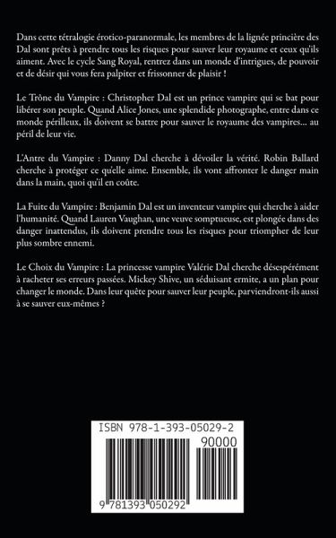 Dans cette tétralogie érotico-paranormale, les membres de la lignée princière des Dal sont prêts à prendre tous les risques pour sauver leur royaume et ceux qu'ils aiment. Avec le cycle Sang Royal, rentrez dans un monde d'intrigues, de pouvoir et de désir qui vous fera palpiter et frissonner de plaisir ! Le Trône du Vampire : Christopher Dal est un prince vampire qui se bat pour libérer son peuple. Quand Alice Jones, une splendide photographe, entre dans ce monde périlleux, ils doivent se battre pour sauver le royaume des vampires… au péril de leur vie. L'Antre du Vampire : Danny Dal cherche à dévoiler la vérité. Robin Ballard cherche à protéger ce qu'elle aime. Ensemble, ils vont affronter le danger main dans la main, quoi qu'il en coûte. La Fuite du Vampire : Benjamin Dal est un inventeur vampire qui cherche à aider l'humanité. Quand Lauren Vaughan, une veuve somptueuse, est plongée dans des danger inattendus, ils doivent prendre tous les risques pour triompher de leur plus sombre ennemi. Le Choix du Vampire : La princesse vampire Valérie Dal cherche désespérément à racheter ses erreurs passées. Mickey Shive, un séduisant ermite, a un plan pour changer le monde. Dans leur quête pour sauver leur peuple, parviendront-ils aussi à se sauver eux-mêmes ?