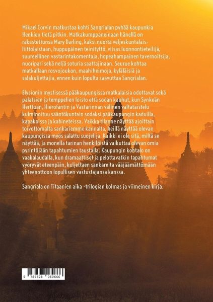 Mikael Corvin matkustaa kohti Sangrialan pyhää kaupunkia Henkien tietä pitkin. Matkakumppaneinaan hänellä on rakastettunsa Mary Darling, kaksi nuorta veljeskuntalaisliittolaistaan, huppupäinen teinityttö, viisas luonnontieteilijä, suureellinen vastarintakomentaja, hopeahampainen tavernoitsija, nuoripari sekä neljä soturia saattajinaan. Seurue kohtaa matkallaan rosvojoukon, maahiheimoja, kyläläisiä ja salakuljettajia, ennen kuin lopulta saavuttavat Sangrialan. Elysionin mystisessä pääkaupungissa matkalaisia odottavat sekä palatsien ja temppelien loisto että sodan kauhut, kun Synkeän Herttuan, Hierofantin ja Vastarinnan välinen valtataistelu kulminoituu sääntökuntain sodaksi pääkaupungin kaduilla, kapakoissa ja kabineteissa. Vaikka tilanne näyttää ajoittain toivottomalta sankariemme kannalta, heillä näyttää olevan kaupungissa myös salattu suojelija. Kaikki ei ole sitä, miltä se näyttää, ja monella tarinan henkilöistä näyttää olevan omia pyrintöjään tapahtumien taustalla. Kaupungin kohtalo näyttää olevan vaakalaudalla, kun dramaattiset ja pelottavatkin tapahtumat vyöryvät eteenpäin, kuljettaen sankareita vääjäämättömään yhteenottoon lopullisen vastustajansa kanssa. Sangriala on Titaanien aika -trilogian kolmas ja viimeinen kirja.