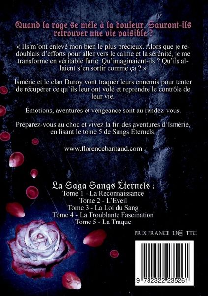 Quand la rage se mêle à la douleur. Sauront-ils retrouver une vie paisible ?« Ils m'ont enlevé mon bien le plus précieux. Alors que je redoublais d'efforts pour aller vers le calme et la sérénité, je me transforme en véritable furie. Qu'imaginaient-ils ? Qu'ils allaient s'en sortir comme ça ? »Ismérie et le clan Duroy vont traquer leurs ennemis pour tenter de récupérer ce qu'ils leur ont volé et reprendre le contrôle de leur vie.Émotions, aventures et vengeance sont au rendez-vous.Préparez-vous au choc et vivez la fin des aventures d'Ismérie, en lisant le tome 5 de Sangs Éternels.
