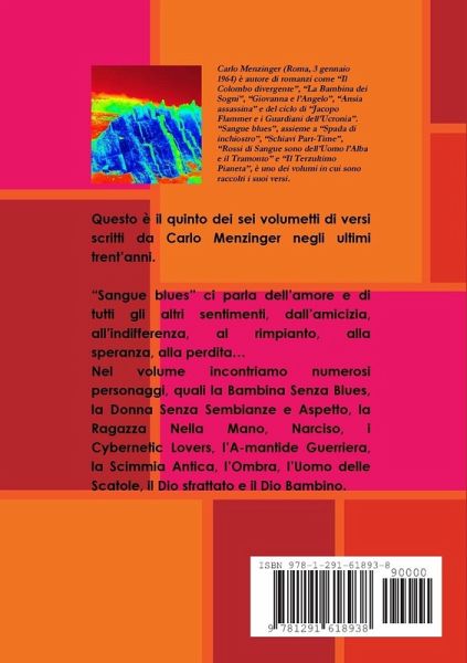 Questo è il quinto dei sei volumetti di versi scritti da Carlo Menzinger negli ultimi trent'anni, dalla fine del Liceo a oggi, ovvero tra il 1983 e il 2013. "Sangue blues" ci parla dell'amore e di tutti gli altri sentimenti, dall'amicizia, all'indifferenza, al rimpianto, alla speranza, alla perdita... Nel volume incontriamo numerosi personaggi, quali la Bambina Senza Blues, la Donna Senza Sembianze e Aspetto, la Ragazza Nella Mano, Narciso, i Cybernetic Lovers, l'A-mantide Guerriera, la Scimmia Antica, l'Ombra, l'Uomo delle Scatole, il Dio sfrattato e il Dio Bambino.