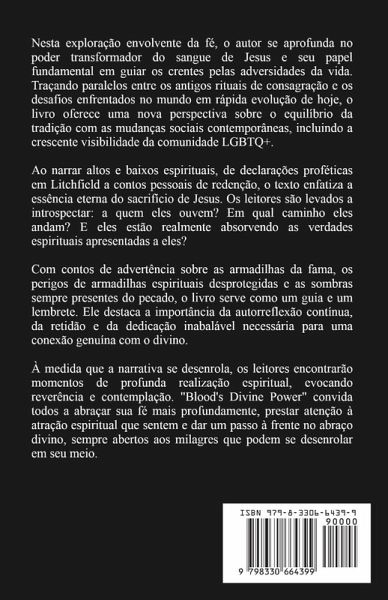 Nesta exploração envolvente da fé, o autor se aprofunda no poder transformador do sangue de Jesus e seu papel fundamental em guiar os crentes pelas adversidades da vida. Traçando paralelos entre os antigos rituais de consagração e os desafios enfrentados no mundo em rápida evolução de hoje, o livro oferece uma nova perspectiva sobre o equilíbrio da tradição com as mudanças sociais contemporâneas, incluindo a crescente visibilidade da comunidade LGBTQ+. Ao narrar altos e baixos espirituais, de declarações proféticas em Litchfield a contos pessoais de redenção, o texto enfatiza a essência eterna do sacrifício de Jesus. Os leitores são levados a introspectar: ¿¿a quem eles ouvem? Em qual caminho eles andam? E eles estão realmente absorvendo as verdades espirituais apresentadas a eles? Com contos de advertência sobre as armadilhas da fama, os perigos de armadilhas espirituais desprotegidas e as sombras sempre presentes do pecado, o livro serve como um guia e um lembrete. Ele destaca a importância da autorreflexão contínua, da retidão e da dedicação inabalável necessária para uma conexão genuína com o divino. À medida que a narrativa se desenrola, os leitores encontrarão momentos de profunda realização espiritual, evocando reverência e contemplação. "Blood's Divine Power" convida todos a abraçar sua fé mais profundamente, prestar atenção à atração espiritual que sentem e dar um passo à frente no abraço divino, sempre abertos aos milagres que podem se desenrolar em seu meio.