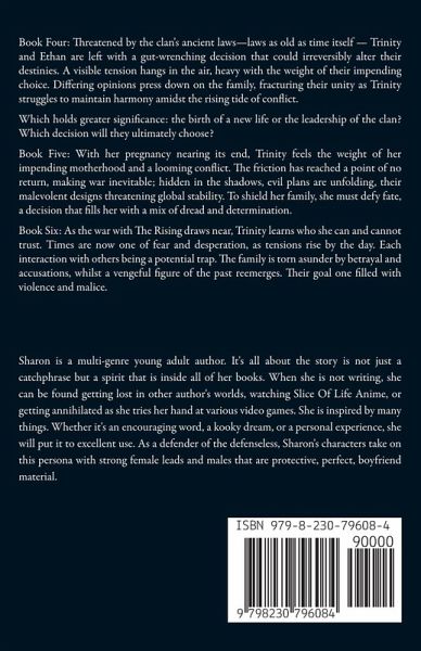 Book Four: Threatened by the clan's ancient laws-laws as old as time itself - Trinity and Ethan are left with a gut-wrenching decision that could irreversibly alter their destinies. A visible tension hangs in the air, heavy with the weight of their impending choice. Differing opinions press down on the family, fracturing their unity as Trinity struggles to maintain harmony amidst the rising tide of conflict. Which holds greater significance: the birth of a new life or the leadership of the clan? Which decision will they ultimately choose? Book Five: With her pregnancy nearing its end, Trinity feels the weight of her impending motherhood and a looming conflict. The friction has reached a point of no return, making war inevitable; hidden in the shadows, evil plans are unfolding, their malevolent designs threatening global stability. To shield her family, she must defy fate, a decision that fills her with a mix of dread and determination. Book Six: As the war with The Rising draws near, Trinity learns who she can and cannot trust. Times are now one of fear and desperation, as tensions rise by the day. Each interaction with others being a potential trap. The family is torn asunder by betrayal and accusations, whilst a vengeful figure of the past reemerges. Their goal one filled with violence and malice.