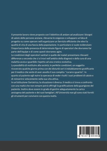 Il presente lavoro viene proposto con l'obiettivo di andare ad analizzare i bisogni di salute delle persone anziane, rilevarne le esigenze e sviluppare un'idea di progetto su come operare nell'organizzare un Servizio efficiente che elevi la qualità di vita di una fascia della popolazione. In particolare si vuole evidenziare l'importanza della presenza di determinate figure di operatori che dovranno far parte dell'équipe e di come questi dovranno agire. Le condizioni degli operatori sanitari e quelle dei malati presentano rilevanti differenze a seconda che ci si trovi nell'ambito della diagnosi e della cura di una malattia acuta e guaribile rispetto ad una cronico-evolutiva. La possibilità di restituire alla società, in perfette condizioni, un soggetto ricoverato qualche giorno prima con dei disturbi seri è indubbiamente gratificante per il medico che sente di aver assolto il suo compito: "curare e guarire". In quanto al paziente egli nutre la speranza di veder risolti i suoi problemi di salute e di reinserirsi velocemente nella sua vita attiva. In un'istituzione Geriatrica, la situazione è diversa. Il medico si trova a confronto con una realtà che non sempre potrà offrirgli la gratificazione della guarigione del paziente. Inoltre deve essere in grado di gestire adeguatamente la carica ansiogena del paziente e dei suoi famigliari. All'Università non gli sono stati forniti gli strumenti per convivere con questa realtà.