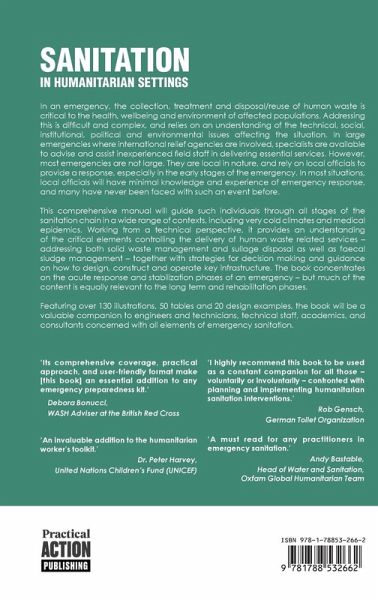 In an emergency the collection, treatment and disposal/reuse of human waste is critical to the health, wellbeing and environment of affected populations. This comprehensive manual will guide individuals through all stages of the sanitation chain in a wide range of contexts.