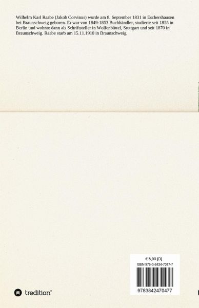 Wilhelm Karl Raabe (Jakob Corvinus) wurde am 8. September 1831 in Eschershausen bei Braunschweig geboren. Er war von 1849-1853 Buchhändler, studierte seit 1855 in Berlin und wohnte dann als Schriftsteller in Wolfenbüttel, Stuttgart und seit 1870 in Braunschweig. Raabe starb am 15.11.1910 in Braunschweig.