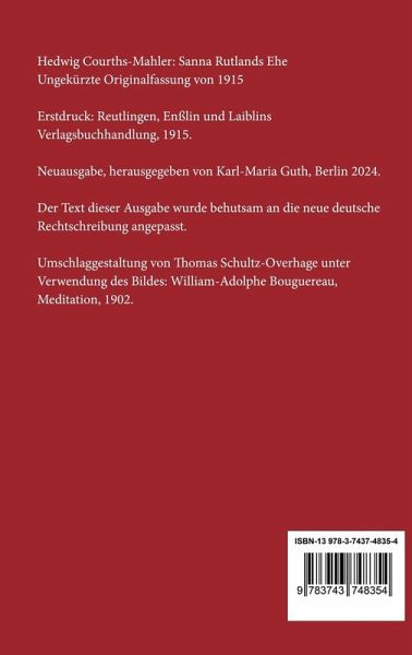Hedwig Courths-Mahler: Sanna Rutlands Ehe. Ungekürzte Originalfassung von 1915 Erstdruck: Reutlingen, Enßlin und Laiblins Verlagsbuchhandlung, 1915. Neuausgabe, herausgegeben von Karl-Maria Guth, Berlin 2024. Der Text dieser Ausgabe wurde behutsam an die neue deutsche Rechtschreibung angepasst. Umschlagabbildung: William-Adolphe Bouguereau, Meditation, 1902 Gesetzt aus der Minion Pro, 11 pt. Henricus - Edition Deutsche Klassik GmbH