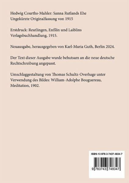 Hedwig Courths-Mahler: Sanna Rutlands Ehe. Ungekürzte Originalfassung von 1915 Erstdruck: Reutlingen, Enßlin und Laiblins Verlagsbuchhandlung, 1915. Neuausgabe, herausgegeben von Karl-Maria Guth, Berlin 2024. Der Text dieser Ausgabe wurde behutsam an die neue deutsche Rechtschreibung angepasst. Umschlagabbildung: William-Adolphe Bouguereau, Meditation, 1902 Gesetzt aus der Minion Pro, 11 pt. Henricus - Edition Deutsche Klassik GmbH