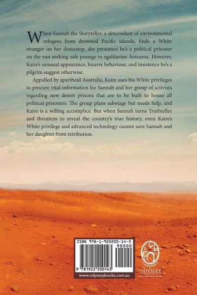 When Sannah the Storyteller, a descendant of environmental refugees from drowned Pacific islands, finds a White stranger on her domestep, she presumes he's a political prisoner on the run seeking safe passage to egalitarian Aotearoa. However, Kaire's unusual appearance, bizarre behaviour, and insistence he's a pilgrim suggest otherwise. Appalled by apartheid Australia, Kaire uses his White privileges to procure vital information for Sannah and her group of activists regarding new desert prisons that are to be built to house all political prisoners. The group plans sabotage but needs help, and Kaire is a willing accomplice. But when Sannah turns Truthteller and threatens to reveal the country's true history, even Kaire's White privilege and advanced technology cannot save Sannah and her daughter from retribution.