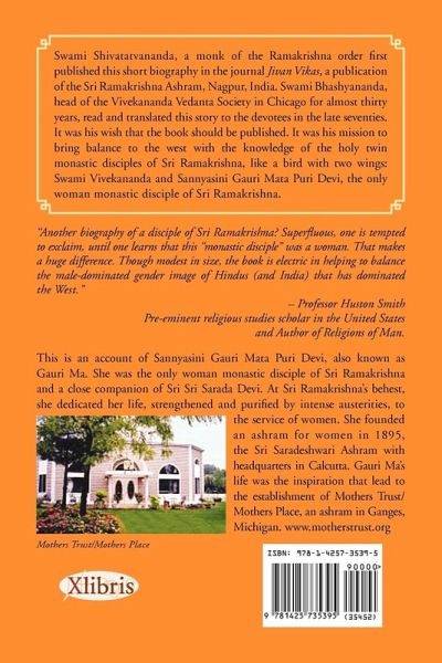 This is an account of Sannyasini Gauri Mata Puri Devi, also known as Gauri Ma. She was the only woman monastic disciple of Sri Ramakrishna and a close companion of Sri Sri Sarada Devi. At Sri Ramakrishna's behest, she dedicated her life, strengthened and purified by intense austerities, to the service of women. She founded an ashram for women in 1895, the Sri Saradeshwari Ashram with headquarters in Calcutta. Gauri Ma's life was the inspiration that lead to the establishment of Mothers Trust/Mothers Place, an ashram in Michigan. www.motherstrust.org