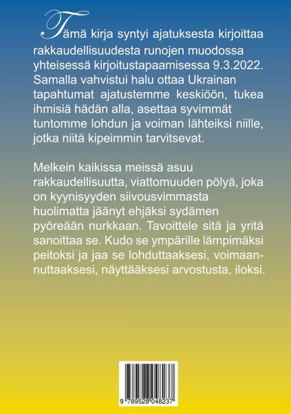 Tämä kirja syntyi ajatuksesta kirjoittaa rakkaudellisuudesta runojen muodossa yhteisessä kirjoitustapaamisessa 9.3.2022. Samalla vahvistui halu ottaa Ukrainan tapahtumat ajatustemme toiseen keskiöön, tukea heitä ja asettaa syvimmät tuntomme lohdun ja voiman lähteiksi niille, jotka niitä kipeimmin tarvitsevat. Melkein kaikissa meissä asuu rakkaudellisuutta, viattomuuden pölyä, joka on kyynisyyden siivousvimmasta huolimatta jäänyt ehjäksi sydämen pyöreään nurkkaan. Tavoittele sitä ja yritä sanoittaa se. Kudo se ympärille lämpimäksi peitoksi ja jaa se lohduttaaksesi, voimaannuttaaksesi, näyttääksesi arvostusta, iloksi.
