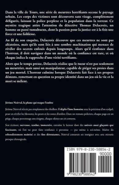 Dans la ville de Tours, une série de meurtres horrifiants secoue le paysage urbain. Les corps des victimes sont découverts sans visage, complètement défigurés, laissant la police perplexe et la population dans la terreur. Ce mystère tragique attire l'attention du détective Thomas Delacroix, un homme au passé tumultueux, dont la passion pour la justice est à la fois une force et une faiblesse. Au fil de son enquête, Delacroix découvre que ces meurtres ne sont pas aléatoires, mais qu'ils sont liés à une sombre machination qui menace de révéler des secrets enfouis depuis longtemps. Alors qu'il s'enfonce dans l'horreur, il doit naviguer dans un monde où la confiance est rare, et où chaque indice le rapproche d'une vérité terrifiante. Alors que le temps presse, Delacroix réalise que le tueur n'est pas seulement un meurtrier, mais aussi un manipulateur, capable de piéger ses proies dans un jeu mortel. L'horreur culmine lorsque Delacroix fait face à ses propres démons, remettant en question sa propre identité dans un jeu où la vie et la mort se mêlent.